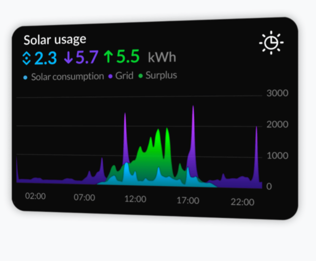 Découvrez la quantité d’énergie solaire que vous consommez instantanément. Plus vous utilisez et utiliserez votre énergie solaire directement et plus vous économiserez. Voyez combien et quand vous auto-consommez au mieux et adaptez en conséquence vos habitudes.